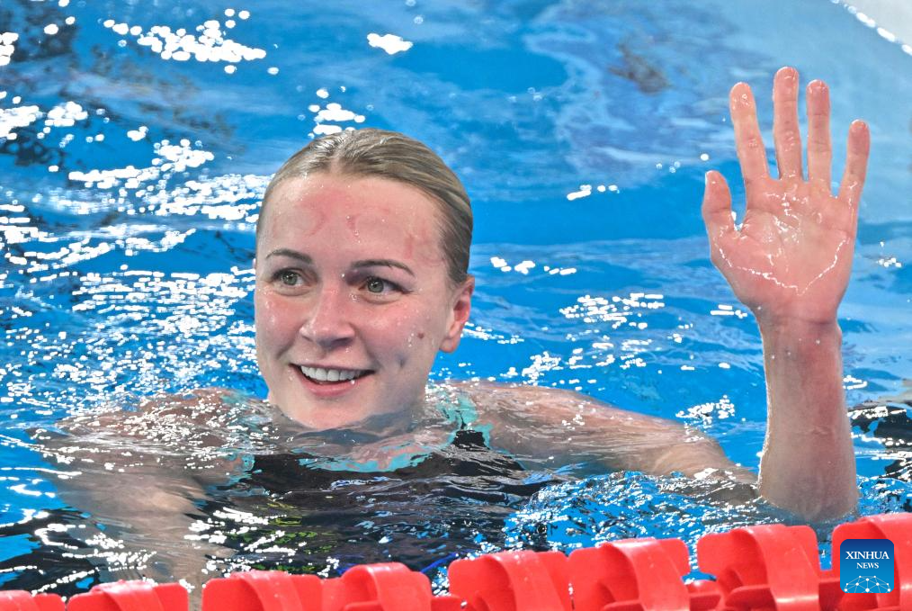 Sarah Sjoestroem of Sweden celebrates after the women's 50m butterfly final of swimming event at the World Aquatics Championships 2024 in Doha, Qatar, Feb. 17, 2024. (Xinhua/Xia Yifang)