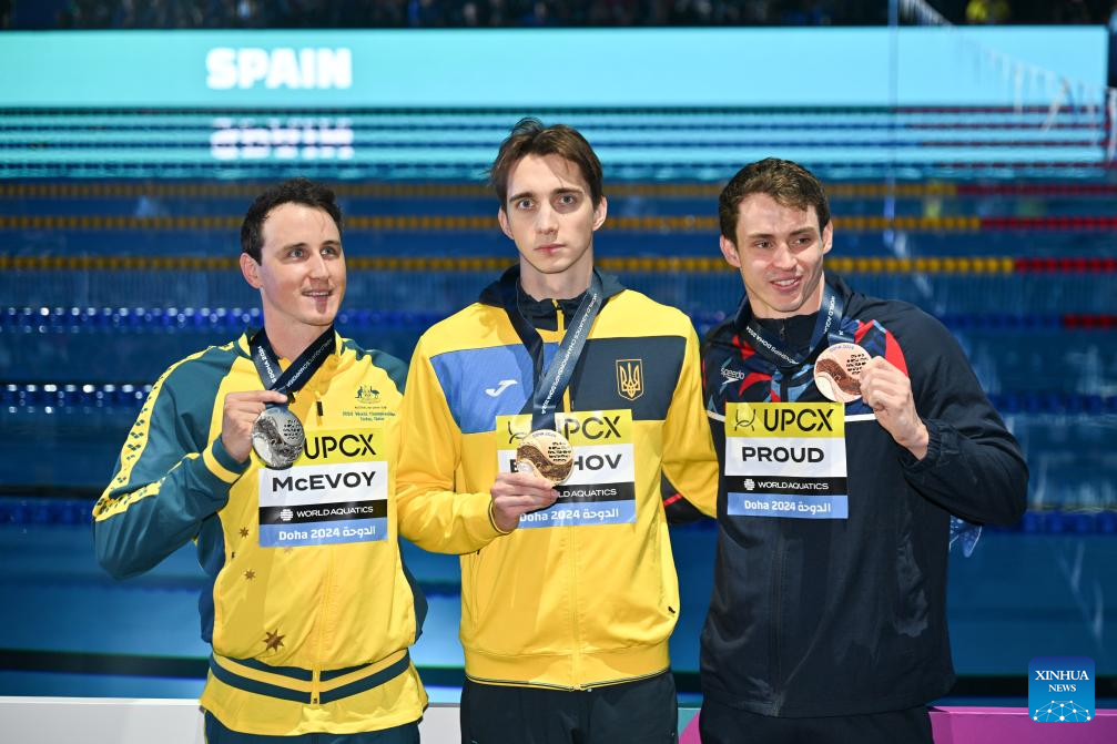 Gold medalist Vladyslav Bukhov of Ukraine, silver medalist Cameron McEvoy of Australia and bronze medalist Benjamin Proud of Britain pose for photograph during the awarding ceremony of the men's 50m freestyle final of swimming event at the World Aquatics Championships 2024 in Doha, Qatar, Feb. 17, 2024. (Xinhua/Xue Yuge)