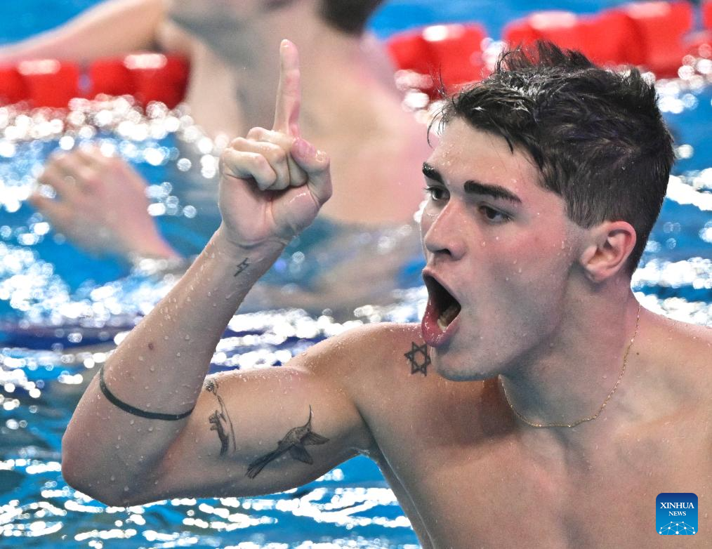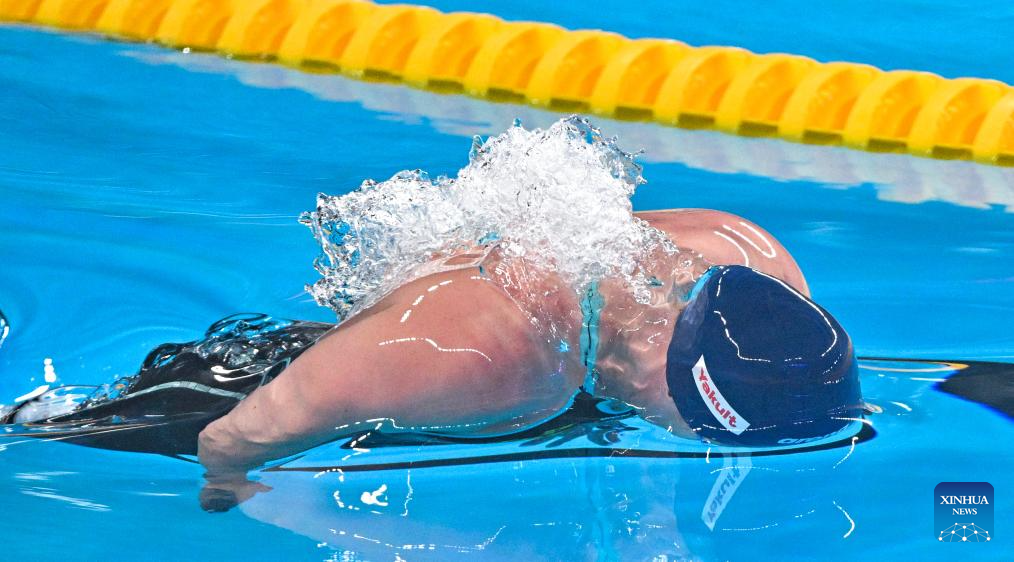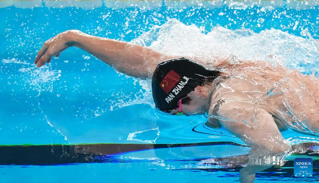Pan Zhanle of team China competes during the mixed 4X100m freestyle relay final of swimming event at the World Aquatics Championships 2024 in Doha, Qatar, Feb. 17, 2024. (Xinhua/Xia Yifang)