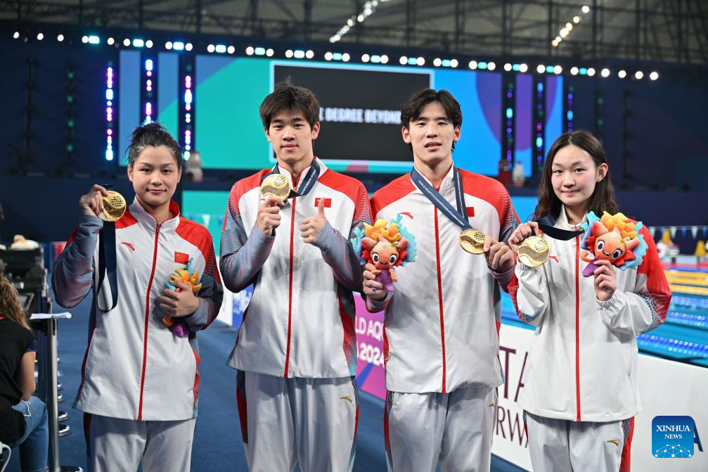 Gold medalists Yu Yiting, Pan Zhanle, Wang Haoyu and Li Bingjie (L-R) of team China pose for photograph after the awarding ceremony of the mixed 4X100m freestyle relay final of swimming event at the World Aquatics Championships 2024 in Doha, Qatar, Feb. 17, 2024. (Xinhua/Xue Yuge)