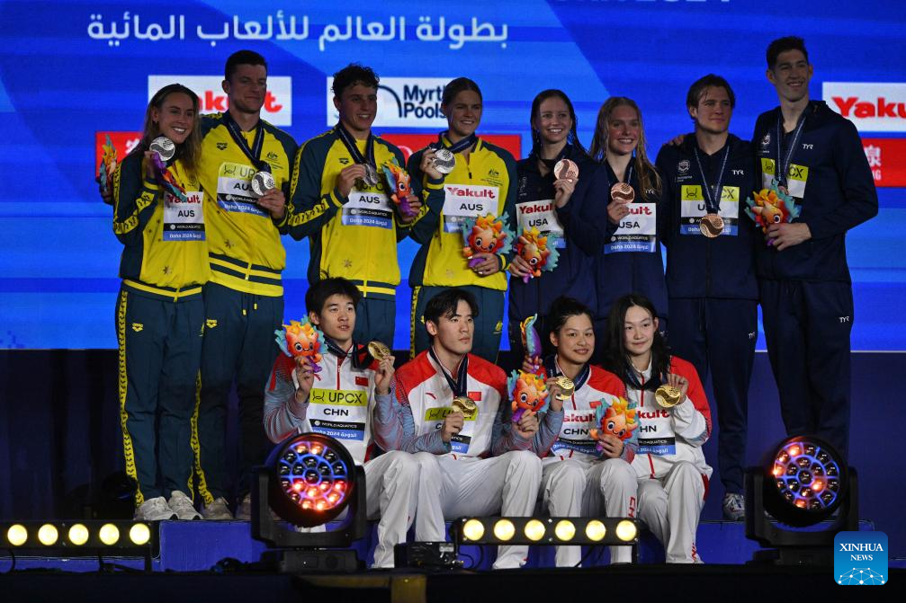 Gold medalist team China (below), silver medalist team Australia and bronze medalist team USA pose for photograph during the awarding ceremony of the mixed 4X100m freestyle relay final of swimming event at the World Aquatics Championships 2024 in Doha, Qatar, Feb. 17, 2024. (Xinhua/Xue Yuge)