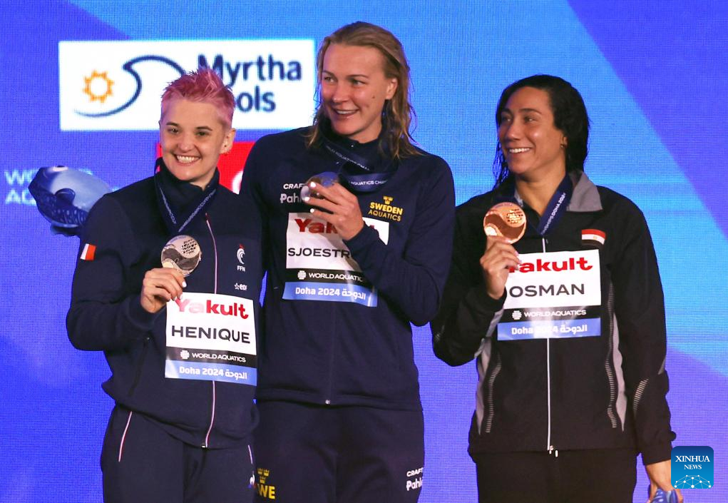 Gold medalist Sarah Sjoestroem (C) of Sweden, silver medalist Melanie Henique (L) of France and bronze medalist Farida Osman of Egypt pose during the awarding ceremony for the women's 50m butterfly final of swimming event at the World Aquatics Championships 2024 in Doha, Qatar, Feb. 17, 2024. (Xinhua/Luo Yuan)