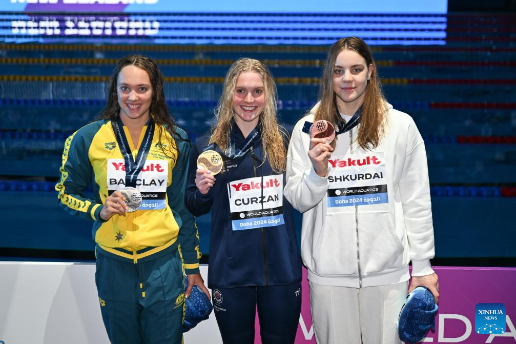 Gold medalist Claire Curzan (C) of the United States, silver medalist Jaclyn Barclay of Australia and bronze medalist Anastasiya Shkurdai pose for photograph after the awarding ceremony of the women's 200m backstroke final of swimming event at the World Aquatics Championships 2024 in Doha, Qatar, Feb. 17, 2024. (Xinhua/Xue Yuge)