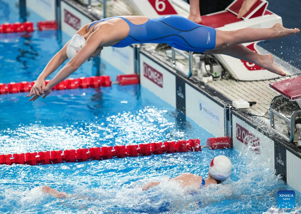 Yu Yiting (top) of team China relays with teammate Li Bingjie during the mixed 4X100m freestyle relay final of swimming event at the World Aquatics Championships 2024 in Doha, Qatar, Feb. 17, 2024. (Xinhua/Xia Yifang)