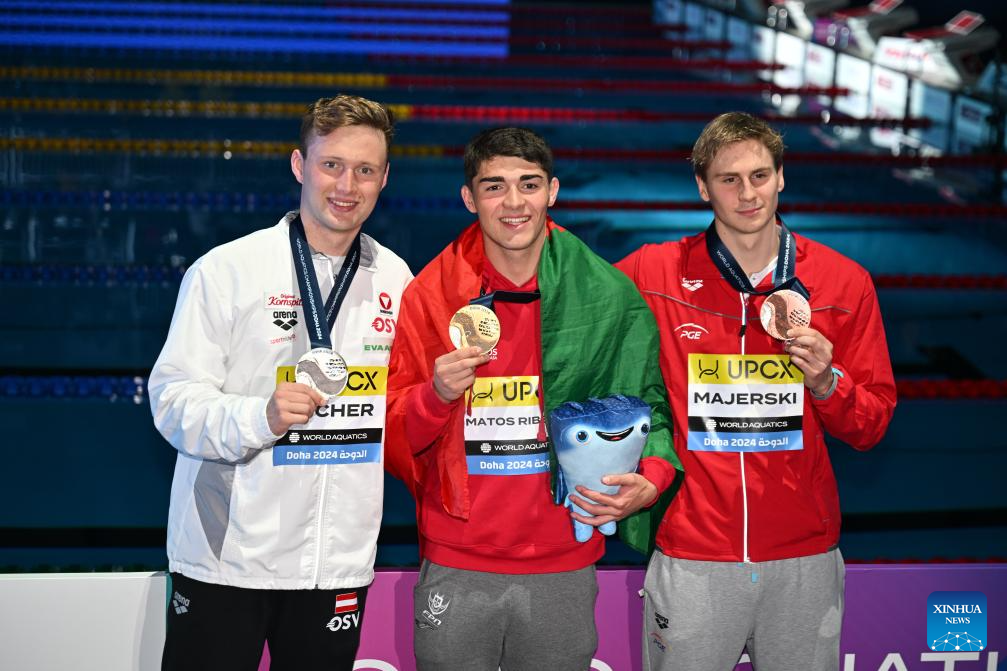 Gold medalist Diogo Matos Ribeiro (C) of Portugal, silver medalist Simon Bucher (L) of Austria and bronze medalist Jakub Majerski of Poland pose for photograph after the awarding ceremony of the men's 100m butterfly final of swimming event at the World Aquatics Championships 2024 in Doha, Qatar, Feb. 17, 2024. (Xinhua/Xue Yuge)