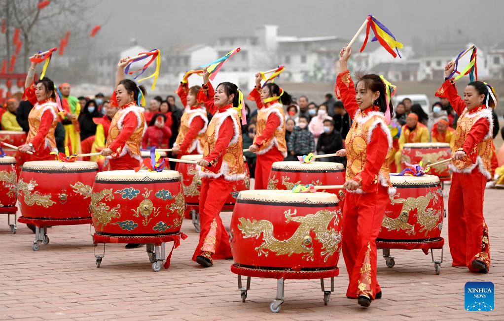 Drum dancers perform in Huyi District, Xi'an of northwest China's Shaanxi Province, Feb. 18, 2024. (Xinhua/Liu Xiao)