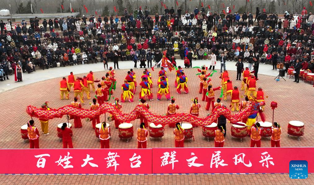 An aerial drone photo taken on Feb. 18, 2024 shows people watching a drum dance in Huyi District, Xi'an of northwest China's Shaanxi Province. (Xinhua/Liu Xiao)