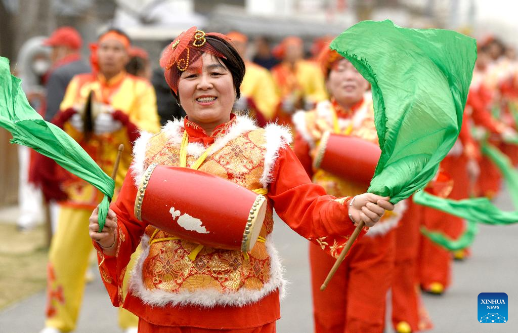 Drum dancers perform in a parade of folk customs in Huyi District, Xi'an of northwest China's Shaanxi Province, Feb. 18, 2024. (Xinhua/Liu Xiao)