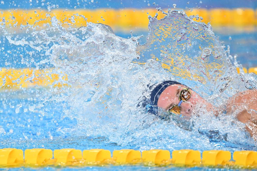 Ireland's Daniel Wiffen dominated the men's 1,500m freestyle, seizing his second gold medal in Doha with a time of 14 minutes and 34.07 seconds, leaving Florian Wellbrock of Germany trailing by 10.54 seconds in second place. France's David Aubry finished third.