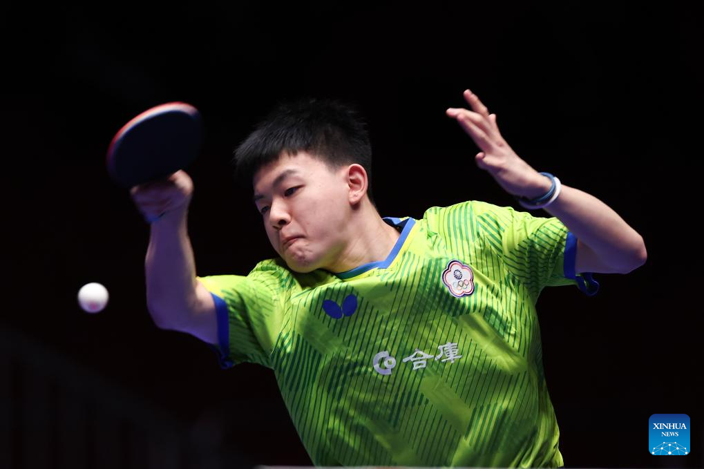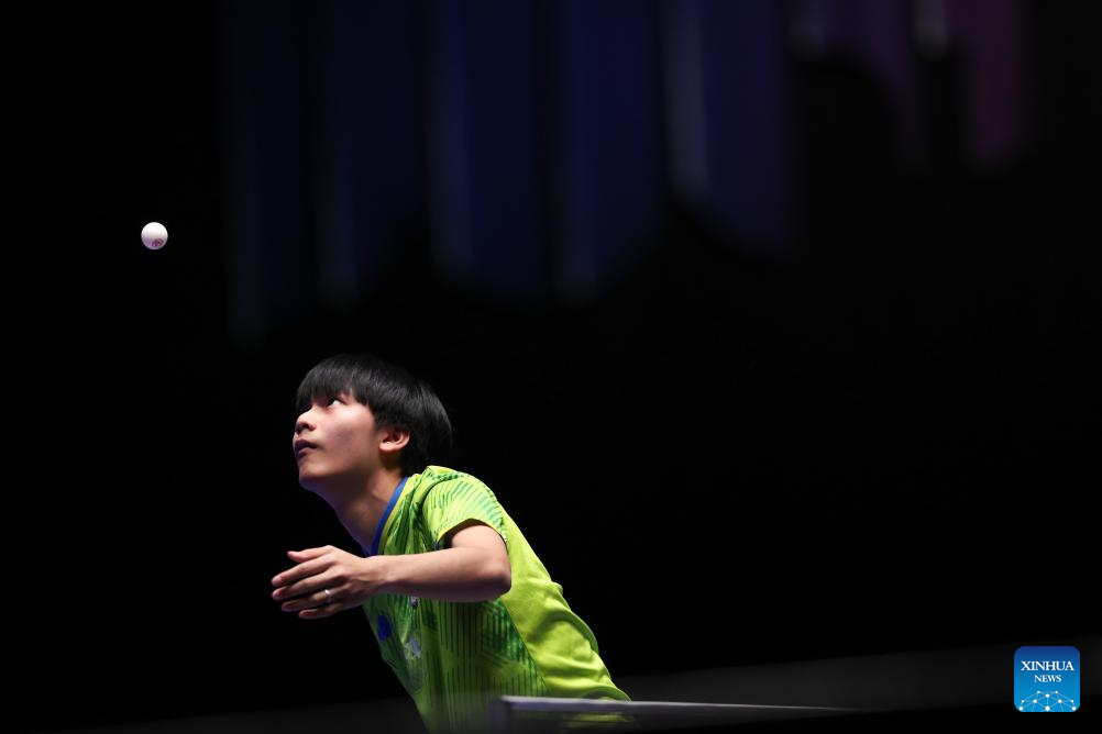 Feng Yi-Hsin of Chinese Taipei competes against Jonathan Nativel of Madagascar during the men's team Group 5 match between Chinese Taipei and Madagascar at the ITTF World Team Table Tennis Championships Finals Busan 2024 in Busan, South Korea, Feb. 20, 2024. (Xinhua/Zhang Tao)