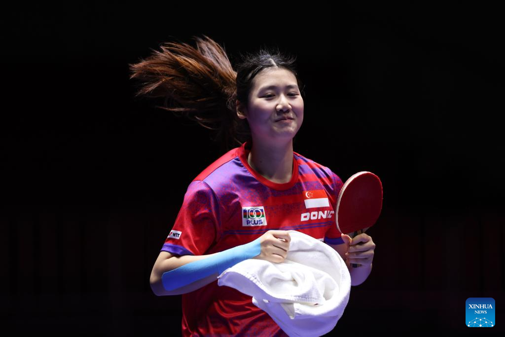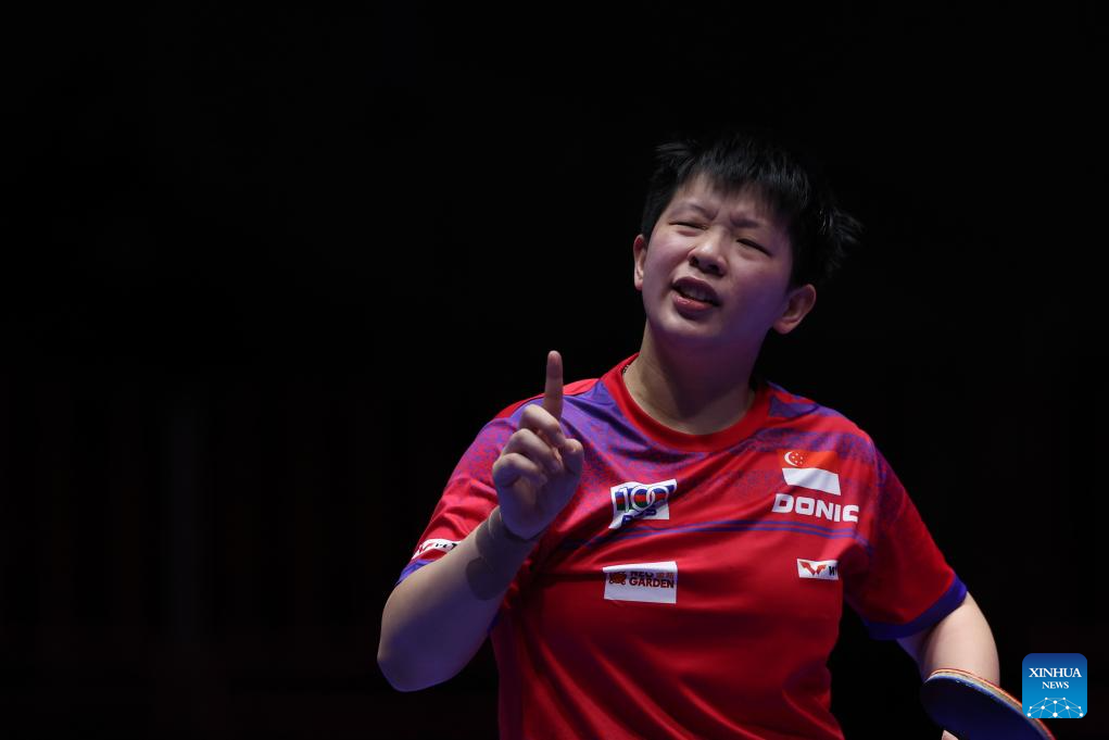 Zeng Jian of Singapore reacts in the match against Sabina Surjan of Serbia during the women's team Group 7 match at the ITTF World Team Table Tennis Championships Finals Busan 2024 in Busan, South Korea, Feb. 20, 2024. (Xinhua/Zhang Tao)