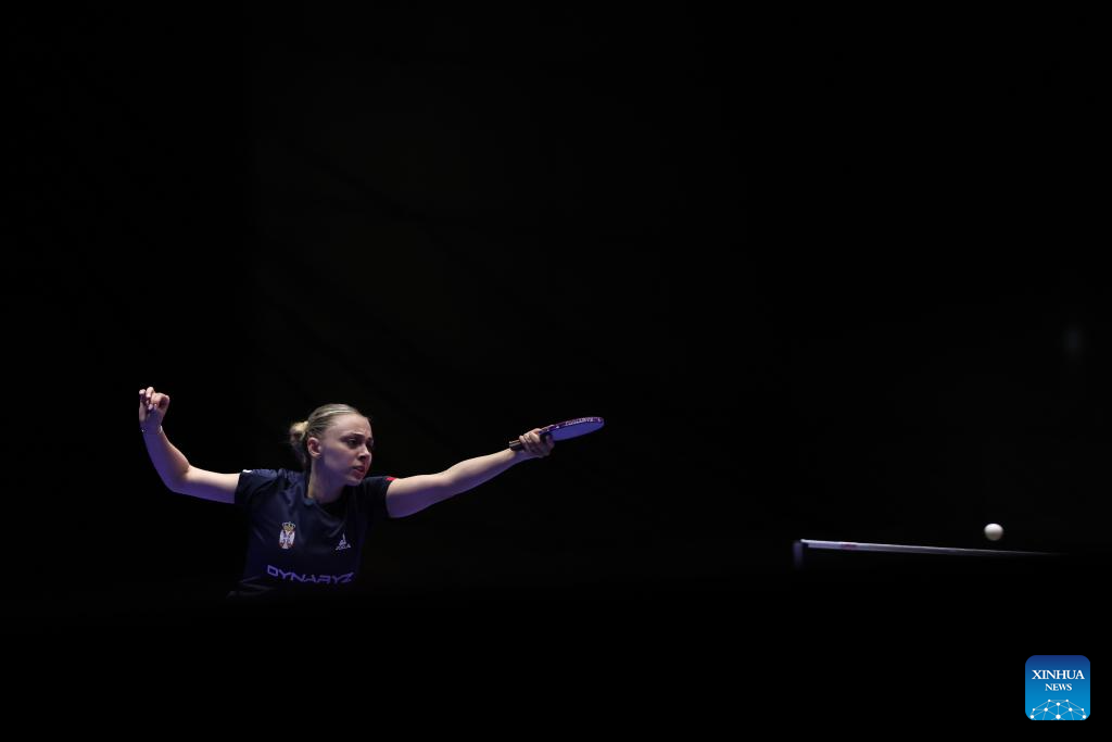 Sabina Surjan of Serbia returns the ball to Zeng Jian of Singapore during the women's team Group 7 match at the ITTF World Team Table Tennis Championships Finals Busan 2024 in Busan, South Korea, Feb. 20, 2024. (Xinhua/Zhang Tao)
