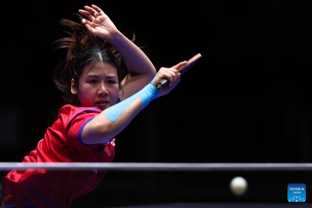 Wong Xin Ru of Singapore returns the ball to Andrea Todorovic of Serbia during the women's team Group 7 match at the ITTF World Team Table Tennis Championships Finals Busan 2024 in Busan, South Korea, Feb. 20, 2024. (Xinhua/Zhang Tao)