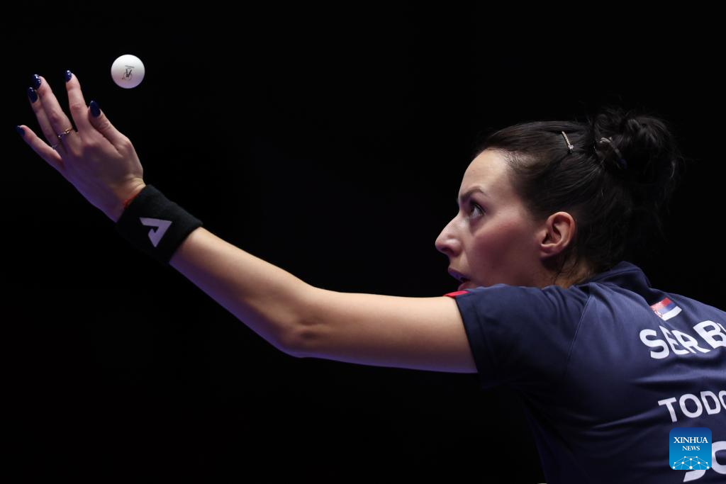 Andrea Todorovic of Serbia serves the ball to Wong Xin Ru of Singapore during the women's team Group 7 match at the ITTF World Team Table Tennis Championships Finals Busan 2024 in Busan, South Korea, Feb. 20, 2024. (Xinhua/Zhang Tao)
