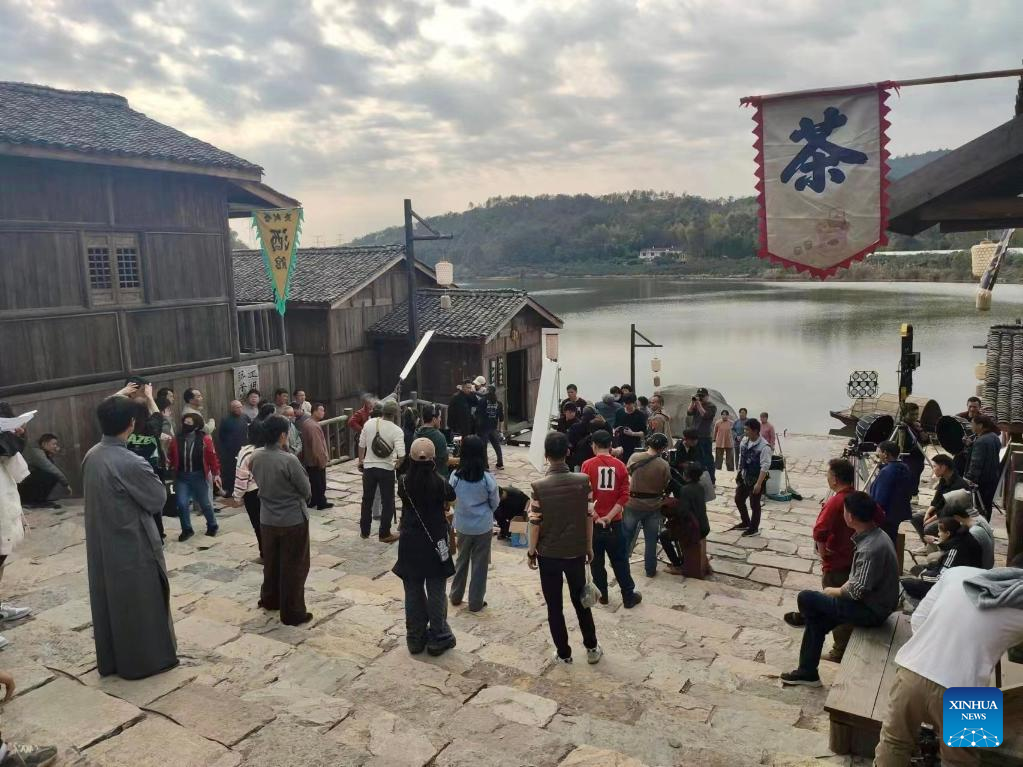 This photo taken with a mobile phone shows a view of a movie shooting site in Hengfeng County of east China's Jiangxi Province, Feb. 17, 2024. (Photo by Xie Huazhong/Xinhua)