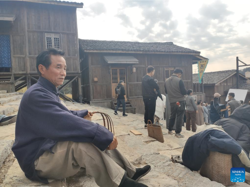 This photo taken with a mobile phone shows local villager Ke Xiufa waiting to work at a movie shooting site in Hengfeng County of east China's Jiangxi Province, Feb. 17, 2024. (Photo by Xie Huazhong/Xinhua)