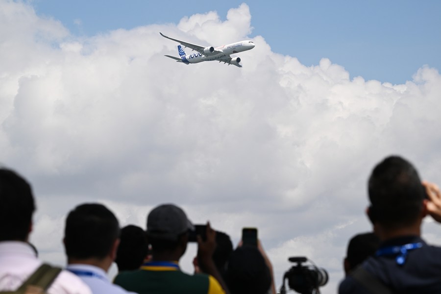 An Airbus A350 passenger aircraft flies during the aerial display of the Singapore Airshow on Feb. 20, 2024. (Photo by Then Chih Wey/Xinhua)