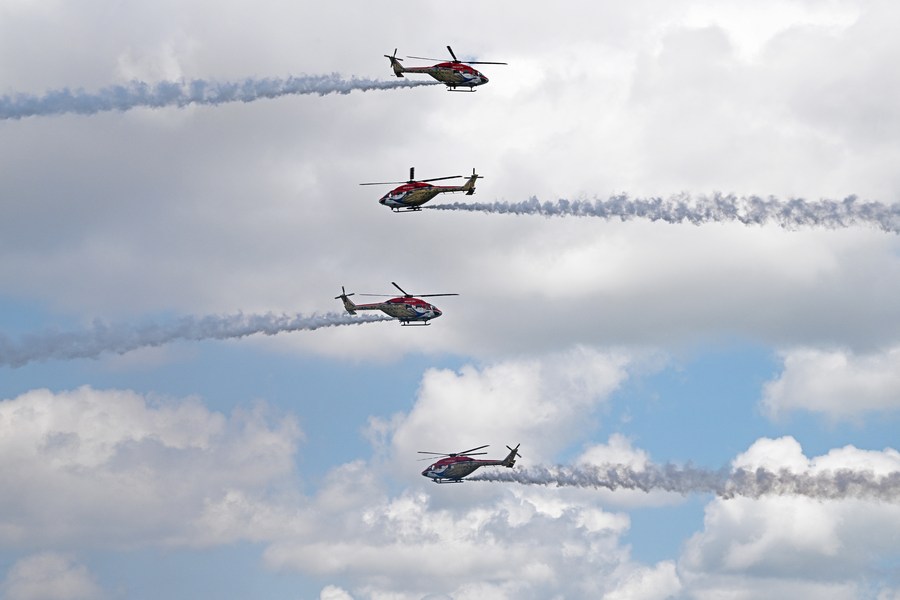 Helicopters of aerobatic team Sarang of Indian Air Force perform during the aerial display of the Singapore Airshow on Feb. 20, 2024. (Photo by Then Chih Wey/Xinhua)