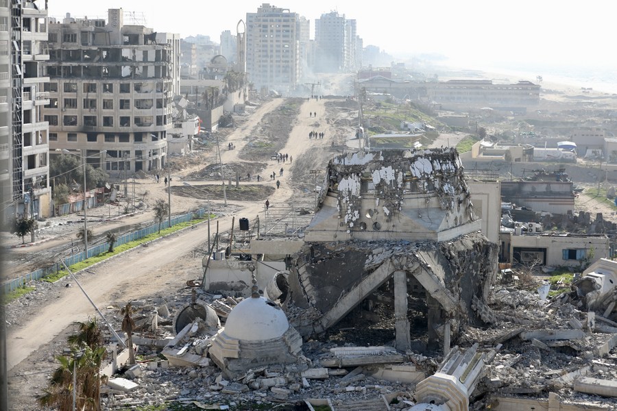 People are seen on a street with destroyed buildings in Gaza City, on Feb. 20, 2024. (Photo by Mohammed Ali/Xinhua)