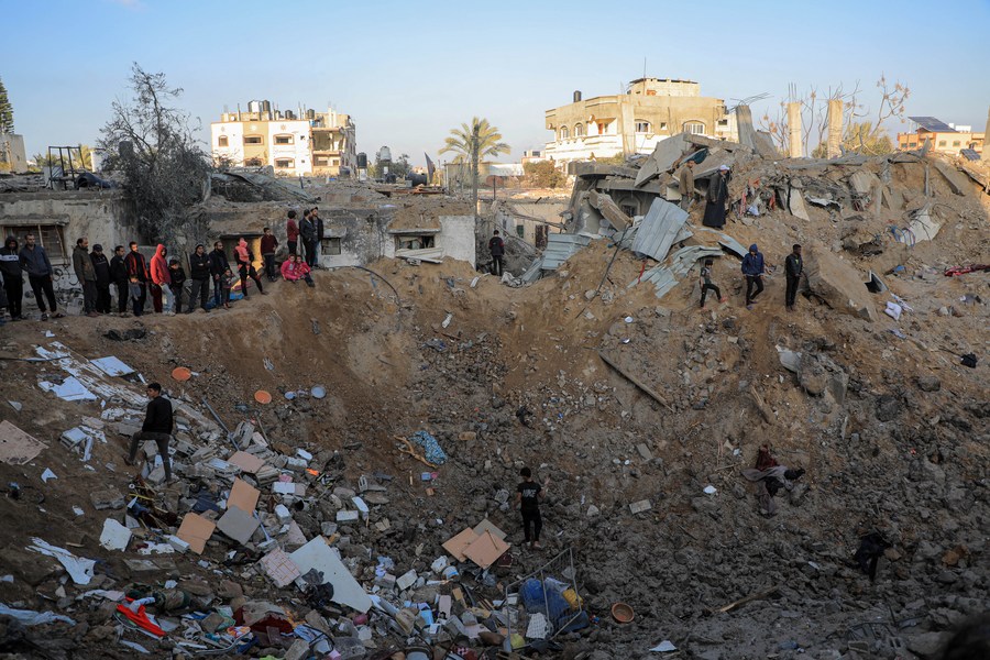 People inspect the damage after an Israeli airstrike in the Nuseirat refugee camp, central Gaza Strip, on Feb. 20, 2024. (Photo by Rizek Abdeljawad/Xinhua)
