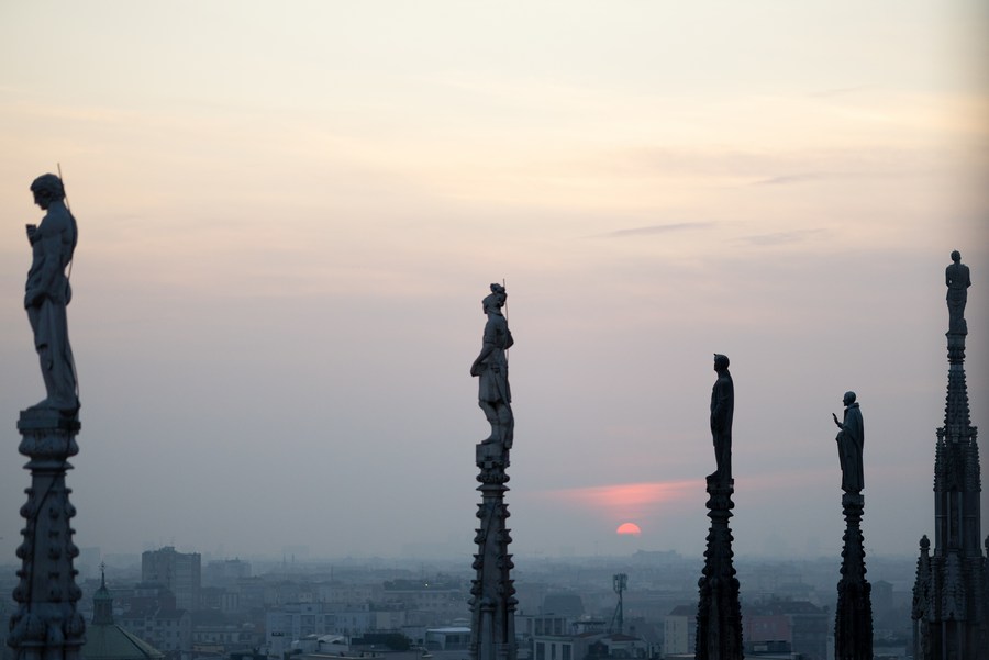 This photo taken on Feb. 20, 2024 from the roof of Duomo Cathedral shows a view of sunset in Milan, Italy. (Xinhua/Li Jing)
