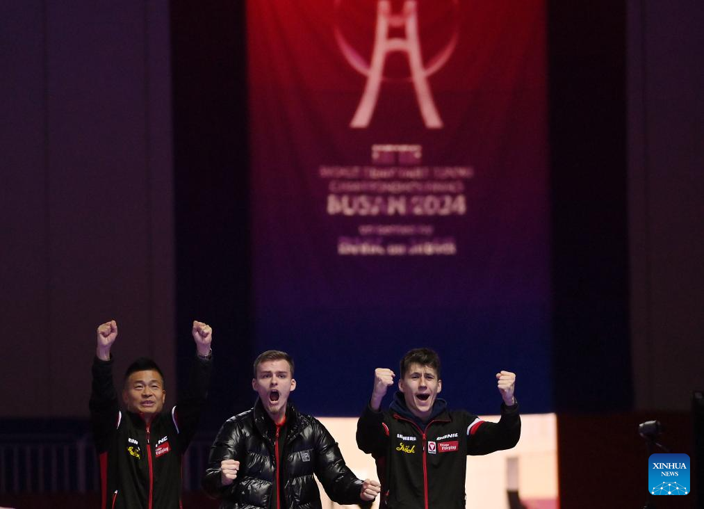 Team Austria celebrates scoring during the men's team round of 32 match between China's Hong Kong and Austria at the ITTF World Team Table Tennis Championships Finals Busan 2024 in Busan, South Korea, Feb. 21, 2024. (Xinhua/Tao Xiyi)