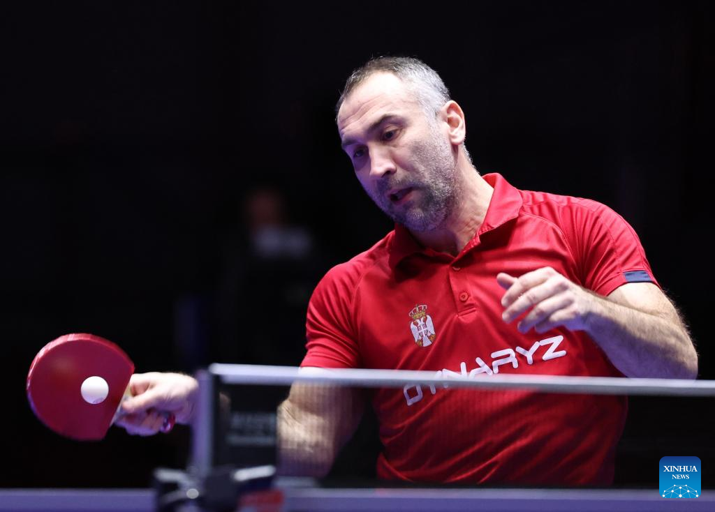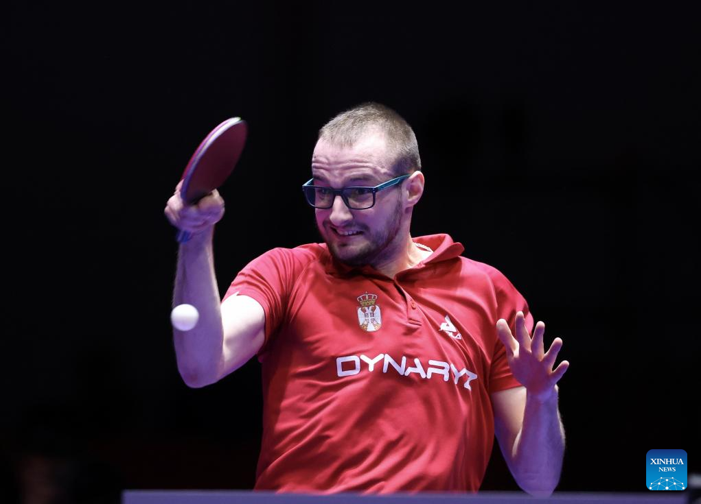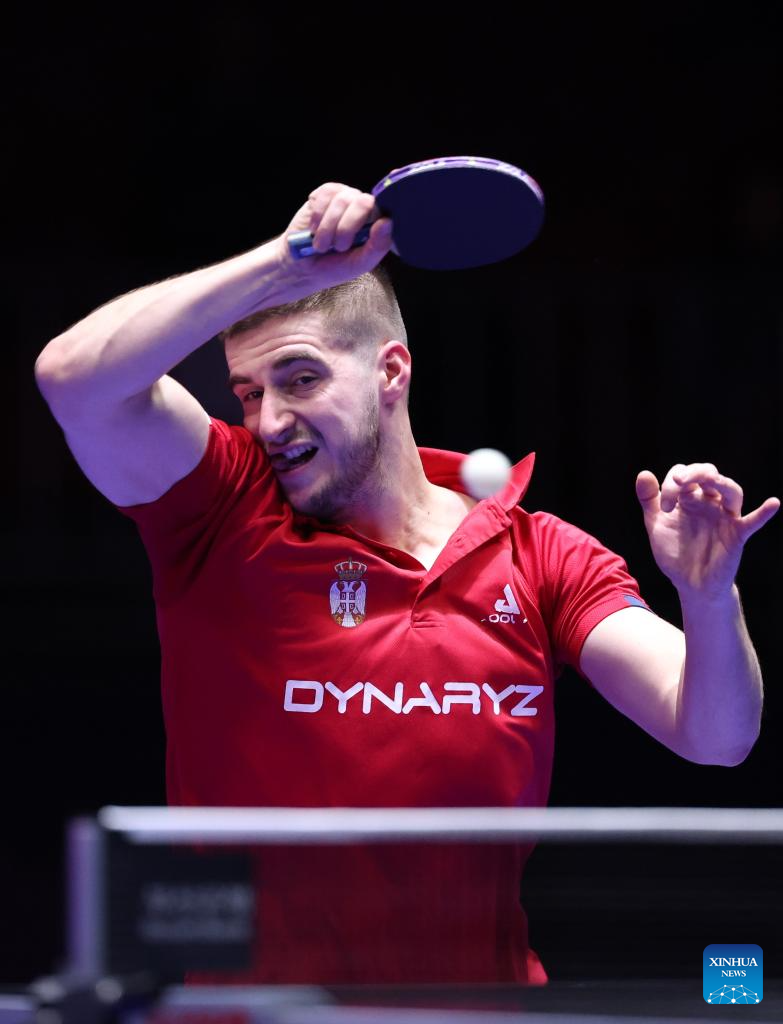 Aleksa Gacev of Serbia competes against Lin Yun-Ju of Chinese Taipei during the men's team round of 32 match between Chinese Taipei and Serbia at the ITTF World Team Table Tennis Championships Finals Busan 2024 in Busan, South Korea, Feb. 21, 2024. (Xinhua/Yang Shiyao)