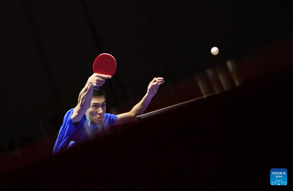 Ma Long of China competes against Darius Movileanu of Romania during the men's team round of 16 match at the ITTF World Team Table Tennis Championships Finals Busan 2024 in Busan, South Korea, Feb. 21, 2024. (Xinhua/Zhang Tao)