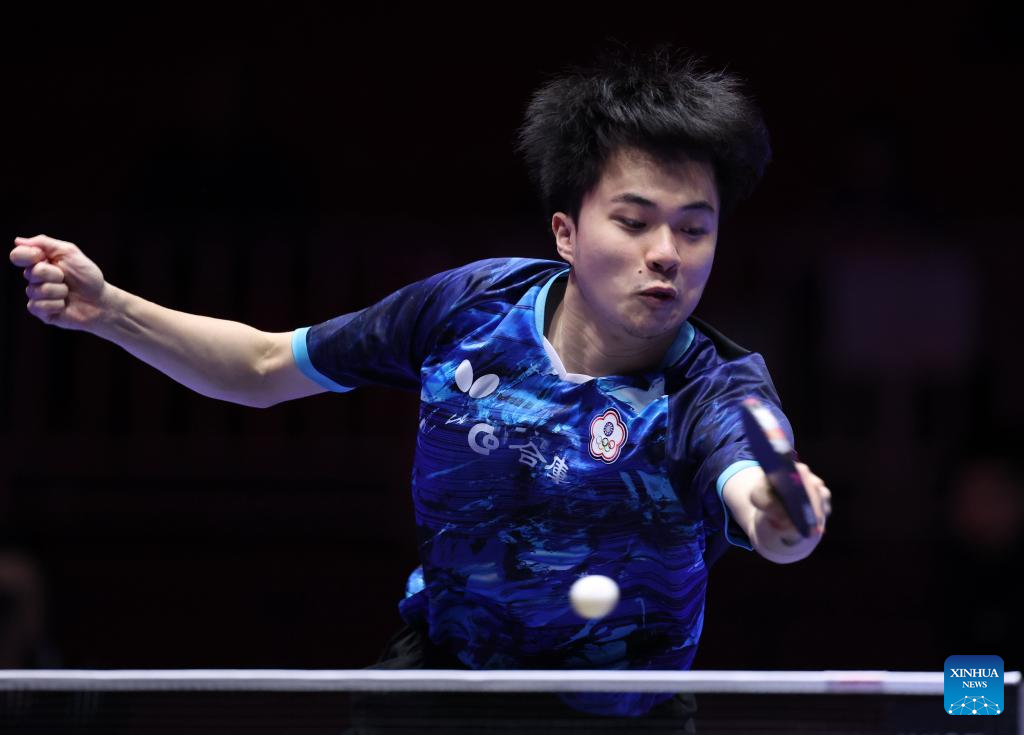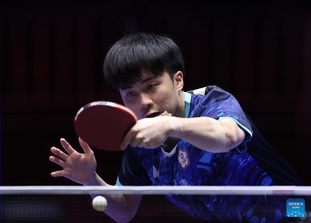 Lin Yun-Ju of Chinese Taipei competes against Aleksa Gacev of Serbia during the men's team round of 32 match between Chinese Taipei and Serbia at the ITTF World Team Table Tennis Championships Finals Busan 2024 in Busan, South Korea, Feb. 21, 2024. (Xinhua/Yang Shiyao)