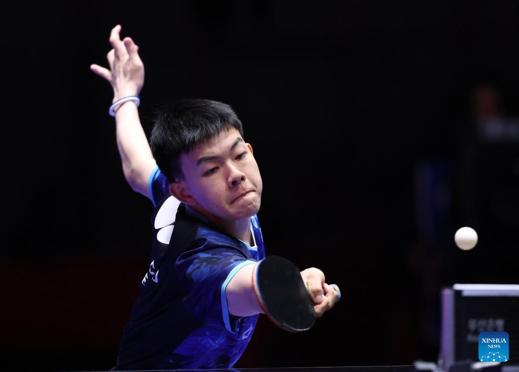 Fan Zhendong of China competes against Eduard Ionescu of Romania during the men's team round of 16 match at the ITTF World Team Table Tennis Championships Finals Busan 2024 in Busan, South Korea, Feb. 21, 2024. (Xinhua/Zhang Tao)