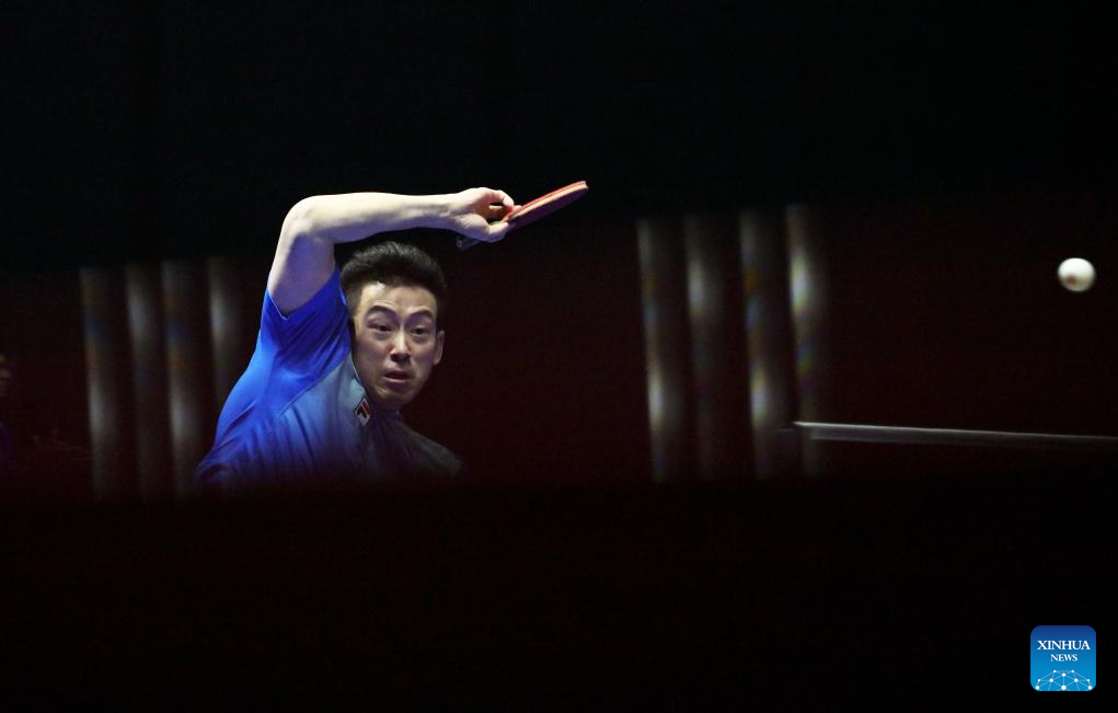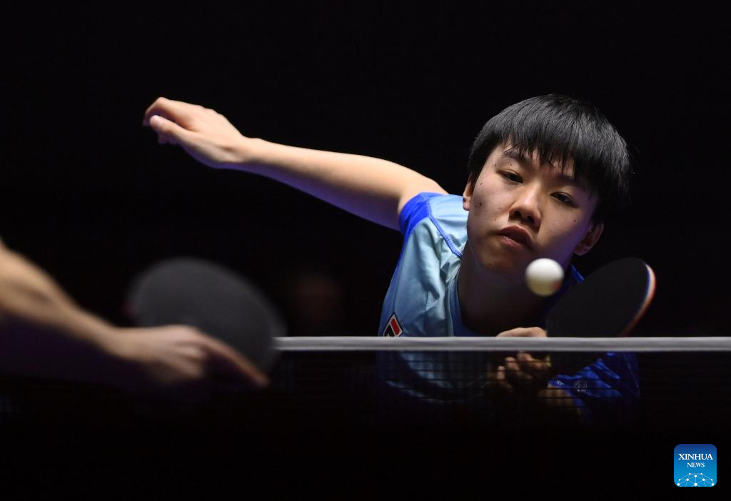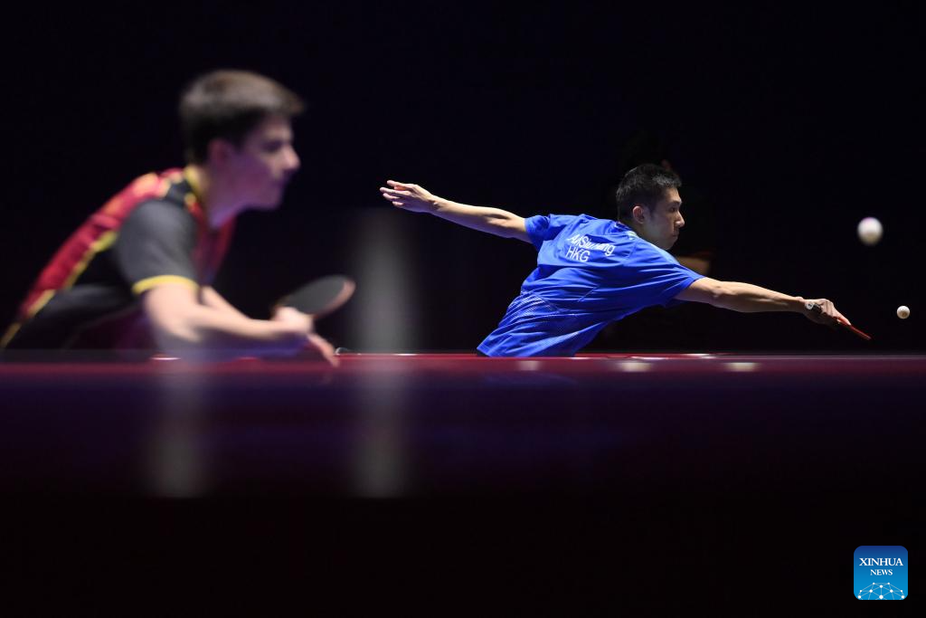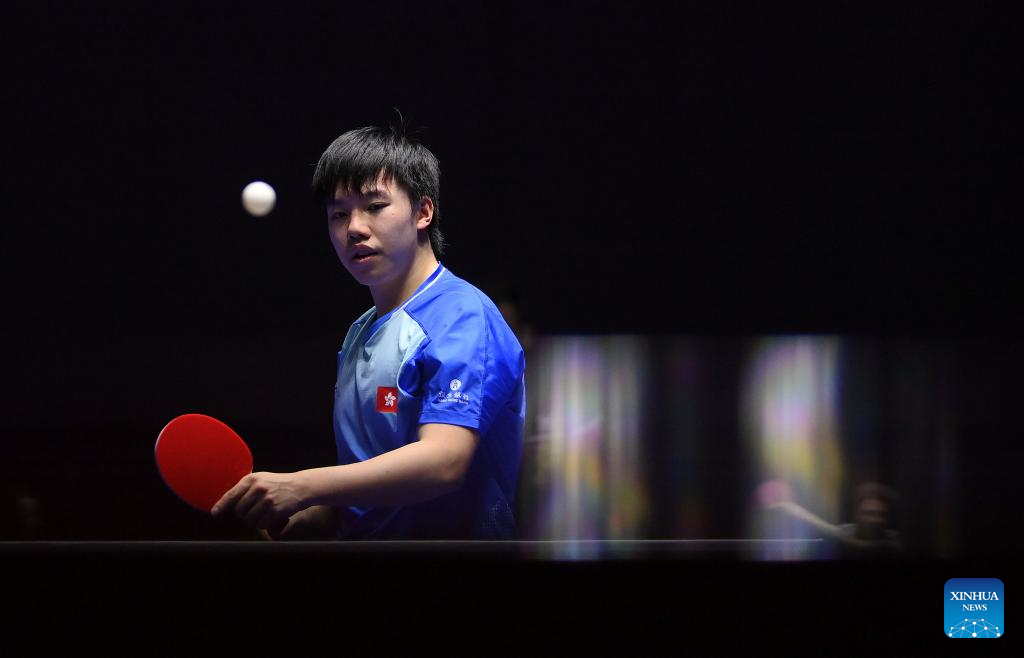 Lam Siu Hang of China's Hong Kong competes against Daniel Habesohn of Austria during the men's team round of 32 match between China's Hong Kong and Austria at the ITTF World Team Table Tennis Championships Finals Busan 2024 in Busan, South Korea, Feb. 21, 2024. (Xinhua/Tao Xiyi)