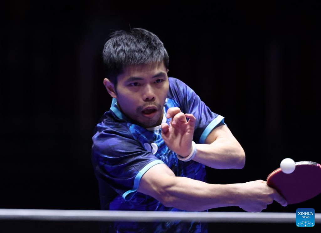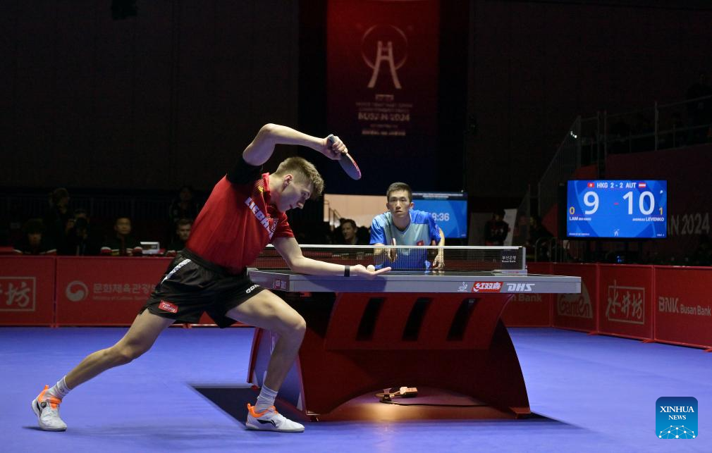 Wong Chun Ting of China's Hong Kong competes against Andreas Levenko of Austria during the men's team round of 32 match between China's Hong Kong and Austria at the ITTF World Team Table Tennis Championships Finals Busan 2024 in Busan, South Korea, Feb. 21, 2024. (Xinhua/Tao Xiyi)