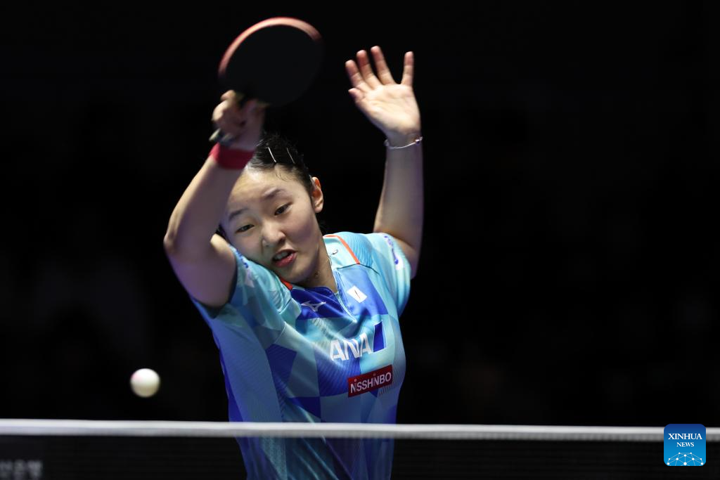 Hayata Hina of Japan competes against Lea Rakovac of Croatia during the women's team round of 16 match between Japan and Croatia at the ITTF World Team Table Tennis Championships Finals Busan 2024 in Busan, South Korea, Feb. 21, 2024. (Xinhua/Zhang Tao)