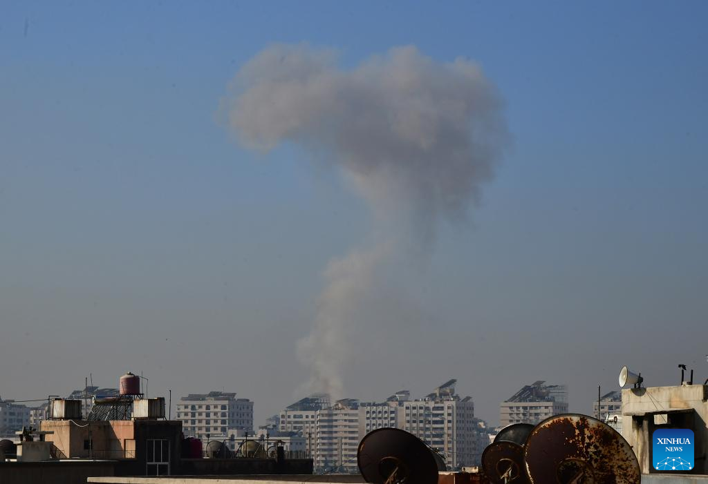 Smoke is seen rising from the residential neighborhood of Kafar Sousah after an Israeli missile attack, in Damascus, Syria, Feb. 21, 2024. Two people were killed in an Israeli missile strike on a residential building in an upscale neighborhood here on Wednesday morning, the Syrian Defense Ministry said in a statement. (Photo by Ammar Safarjalani/Xinhua)