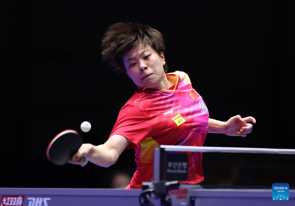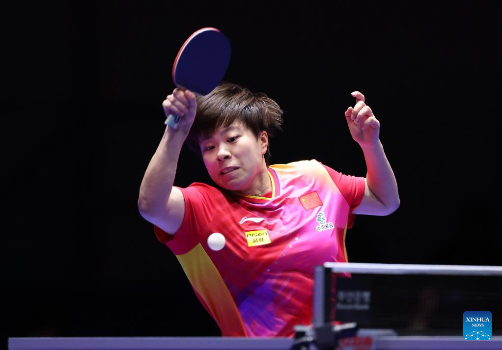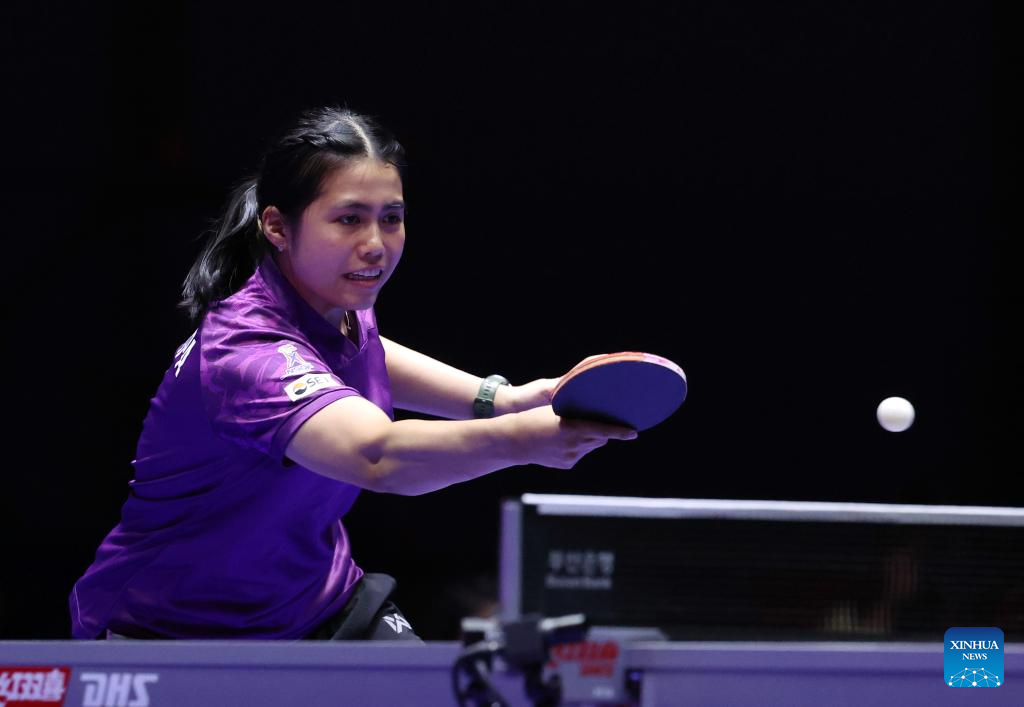 Wang Yidi of China competes against Orawan Paranang of Thailand during the women's team round of 16 match between China and Thailand at the ITTF World Team Table Tennis Championships Finals Busan 2024 in Busan, South Korea, Feb. 21, 2024. (Xinhua/Yang Shiyao)