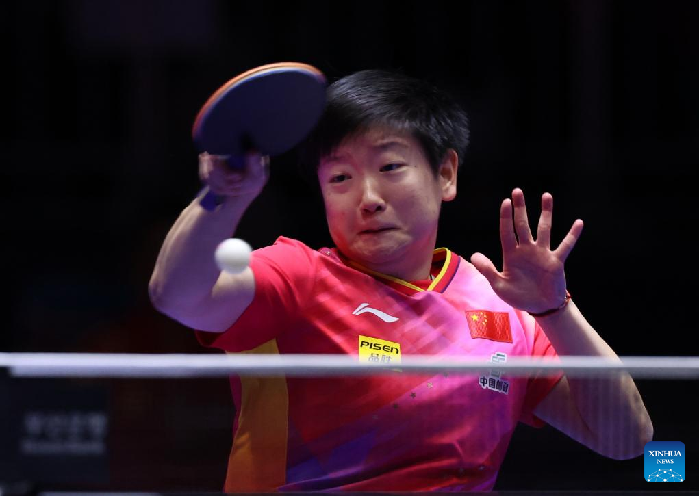 Sun Yingsha of China competes against Jinnipa Sawettabut of Thailand during the women's team round of 16 match between China and Thailand at the ITTF World Team Table Tennis Championships Finals Busan 2024 in Busan, South Korea, Feb. 21, 2024. (Xinhua/Yang Shiyao)