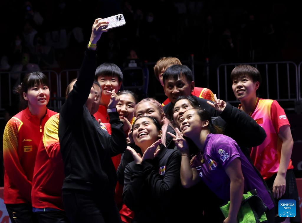 Members of Team China and Team Thailand take a selfie after their women's team round of 16 match at the ITTF World Team Table Tennis Championships Finals Busan 2024 in Busan, South Korea, Feb. 21, 2024. (Xinhua/Yao Qilin)