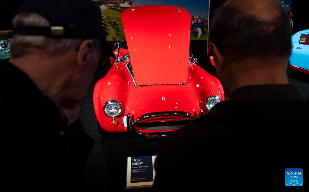 People look at a 1966 Shelby Cobra 427 Roadster at the 2024 Canadian International AutoShow (CIAS) in Toronto, Canada, on Feb. 21, 2024. Showcasing a stunning array of vintage automobiles, the vintage car exhibition runs from Feb. 16 to Feb. 25 at the 2024 CIAS. (Photo by Zou Zheng/Xinhua)