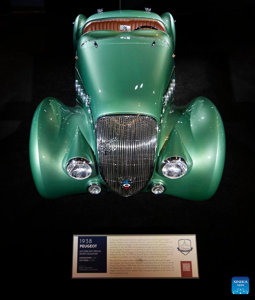 A 1938 Peugeot 402 Darl'mat Special Sports Roadster is on display at the 2024 Canadian International AutoShow (CIAS) in Toronto, Canada, on Feb. 21, 2024. Showcasing a stunning array of vintage automobiles, the vintage car exhibition runs from Feb. 16 to Feb. 25 at the 2024 CIAS. (Photo by Zou Zheng/Xinhua)