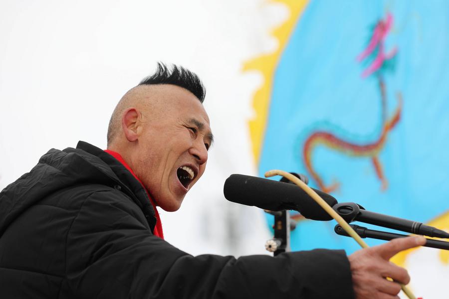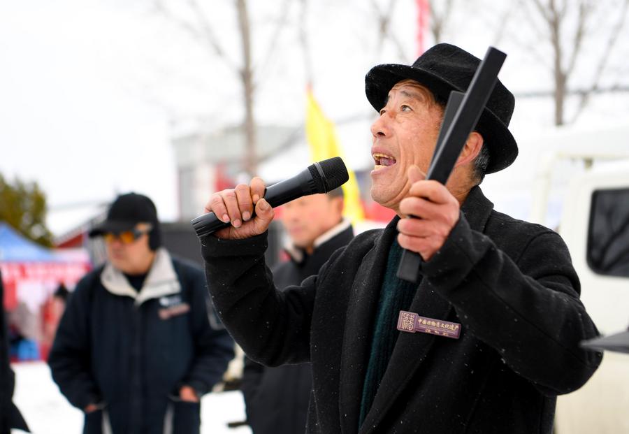 A folk artist performs during the Quyi fair in Majie Village of Baofeng County, central China's Henan Province, Feb. 22, 2024. (Xinhua/Hao Yuan)