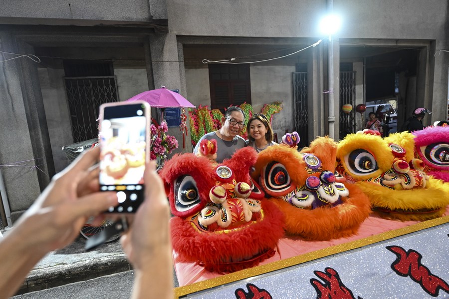 People pose for a photo with lion dance props during the Penang Chinese New Year Celebration in George Town, Penang, Malaysia, Feb. 18, 2024. (Photo by Xu Xinyu/Xinhua)■