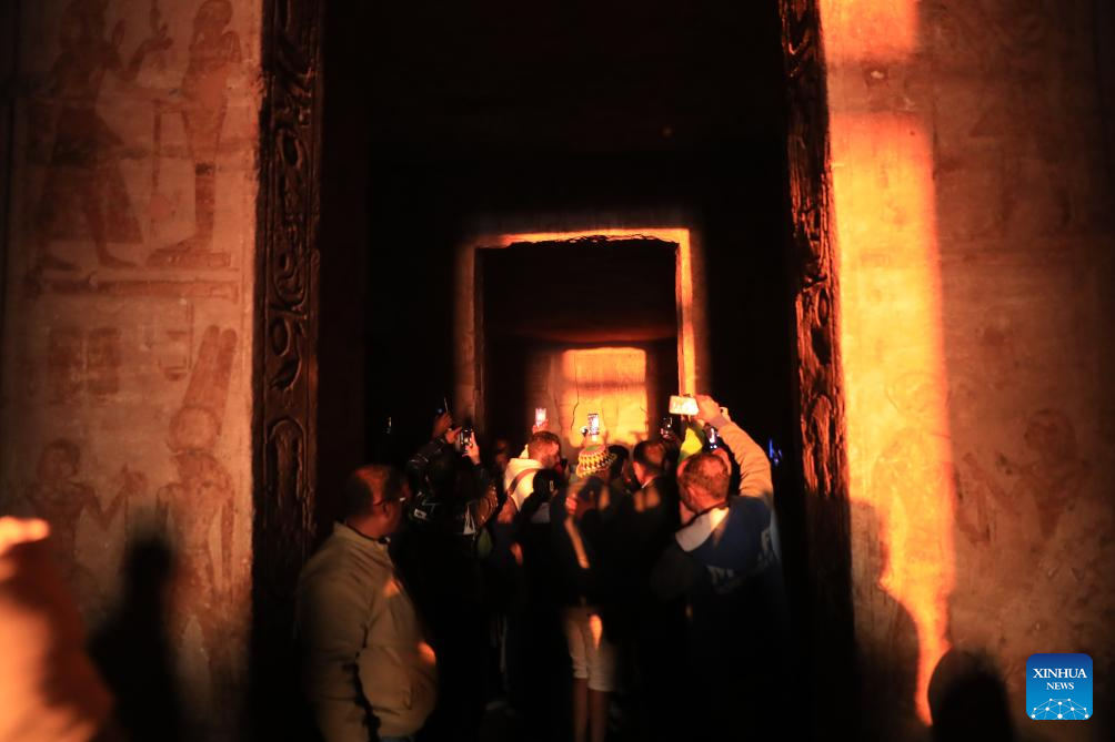 This photo taken on Feb. 22, 2024 shows rays of morning sun reaching into the Great Temple of Abu Simbel during the Sun Festival in Aswan, Egypt. During the Sun Festival, which falls on Feb. 22 and Oct. 22 every year, rays of the morning sun would reach the innermost shrine of the Great Temple of Abu Simbel and illuminate the inside sculptures. (Xinhua/Sui Xiankai)