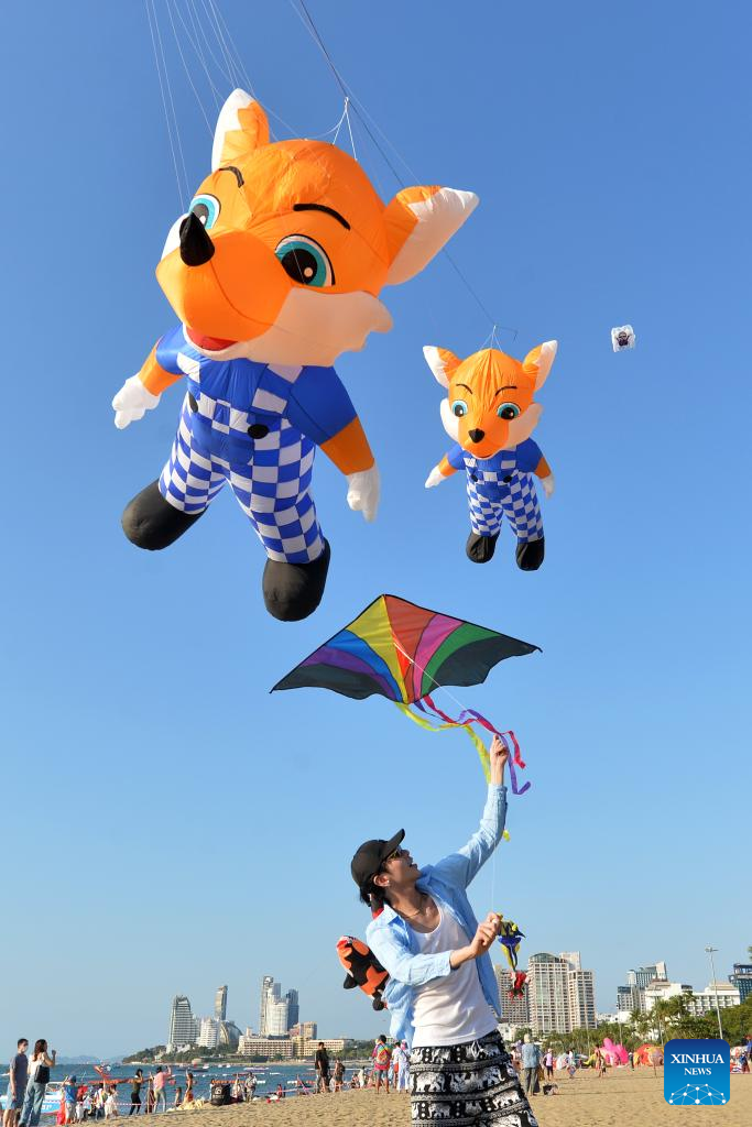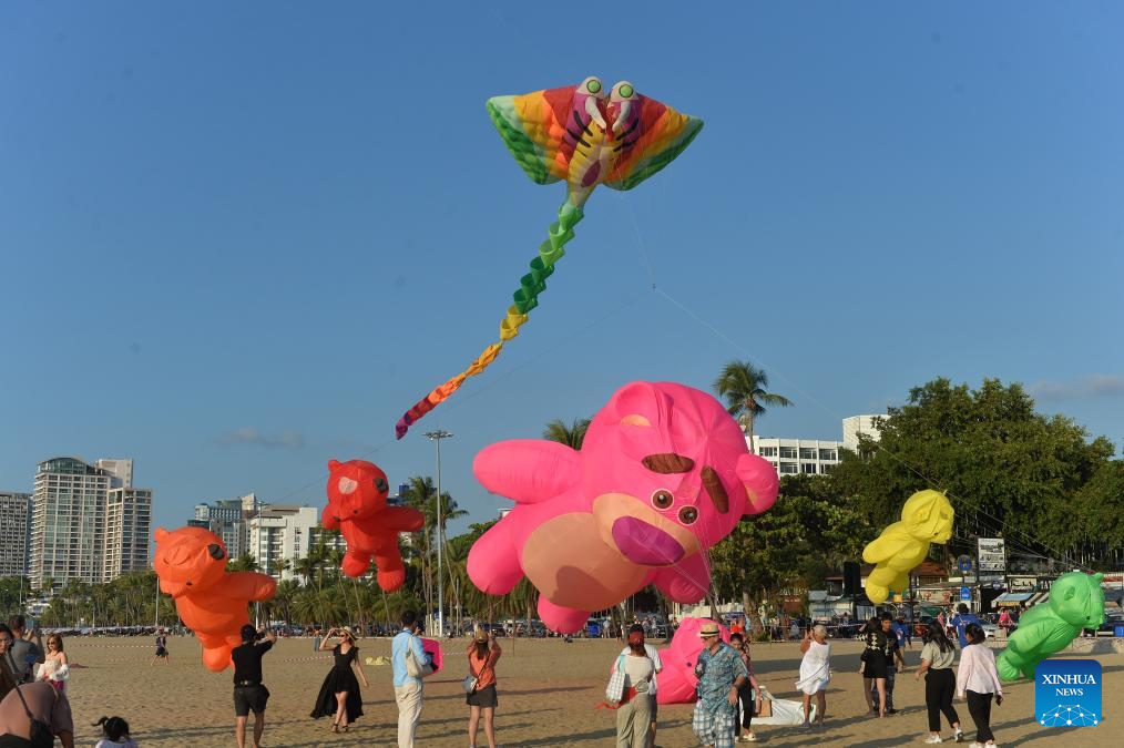 People fly kites on the beach in Pattaya, Thailand, Feb. 22, 2024. Pattaya International Kite On The Beach 2024 kicked off here on Thursday and will last until Feb. 26. (Xinhua/Rachen Sageamsak)