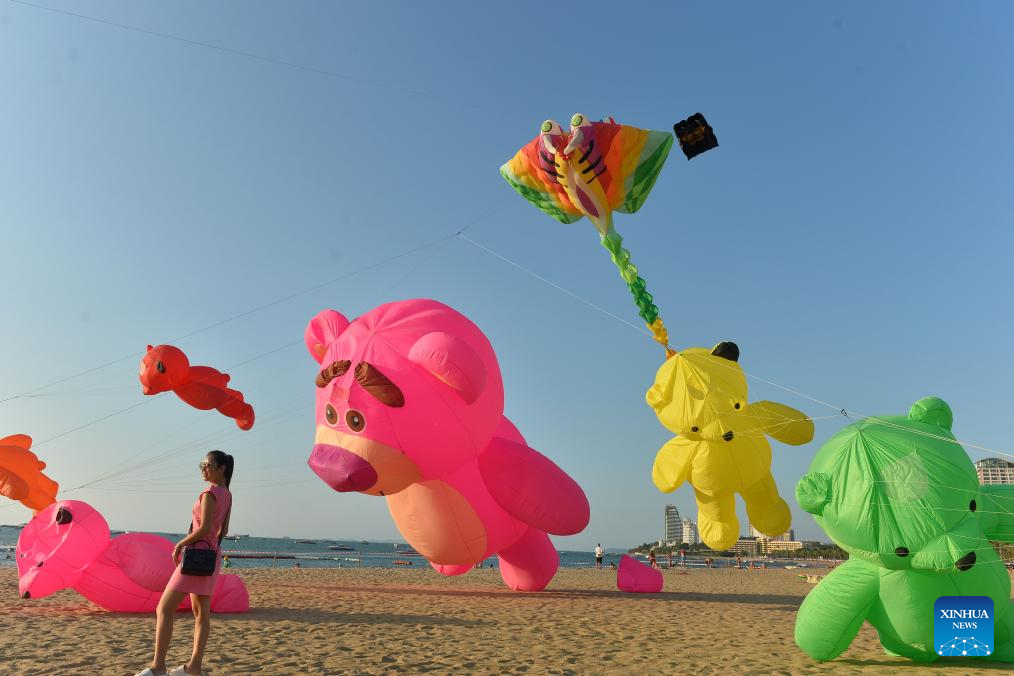 A tourist poses for photos with kites on the beach in Pattaya, Thailand, Feb. 22, 2024. Pattaya International Kite On The Beach 2024 kicked off here on Thursday and will last until Feb. 26. (Xinhua/Rachen Sageamsak)