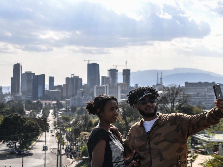 Tourists take a selfie with the city view of Addis Ababa, Ethiopia, Feb. 18, 2024. (Xinhua/Li Yahui)