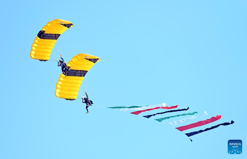 A skydiver makes stunt moves during a show in Ahmadi Governorate, Kuwait, Feb. 22, 2024. A skydiving show is held on Thursday to celebrate the upcoming National Day of Kuwait. (Photo by Asad/Xinhua)