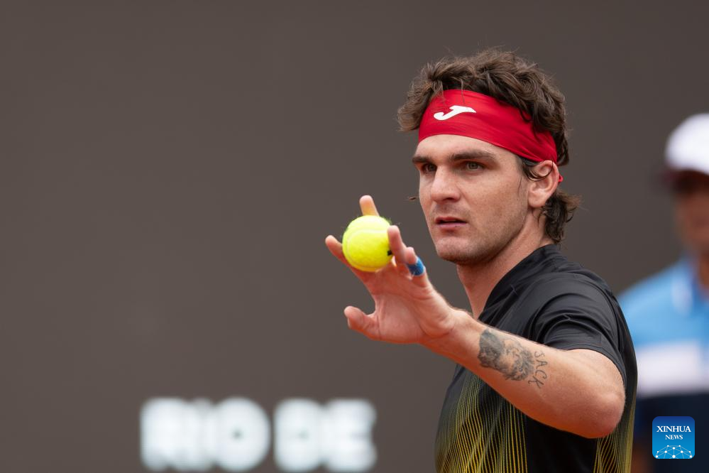 Thiago Seyboth Wild of Brazil hits a return during the round 16 match against Jaume Antoni Munar Clar of Spain at the 2024 ATP500 Rio Open at Jockey Club Brasileiro in Rio de Janeiro, Brazil, Feb. 22, 2024. (Xinhua/Wang Tiancong)