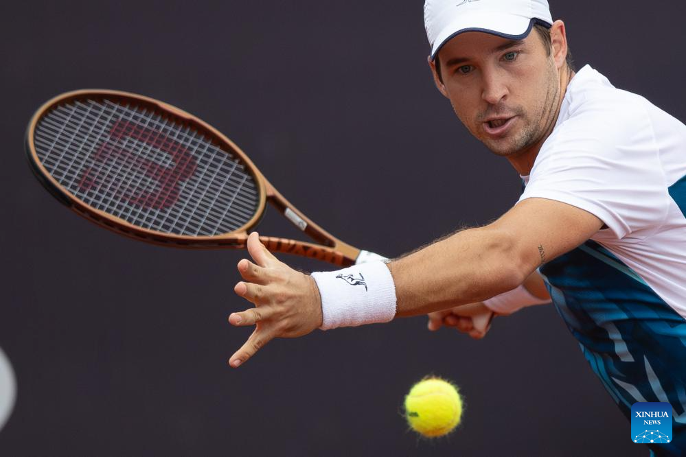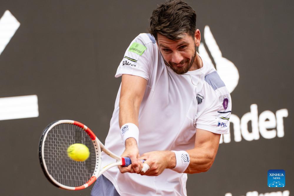 Dusan Lajovic of Serbia hits a return during the round 16 match against Laslo Djere of Serbia at the 2024 ATP500 Rio Open at Jockey Club Brasileiro in Rio de Janeiro, Brazil, Feb. 22, 2024. (Xinhua/Wang Tiancong)