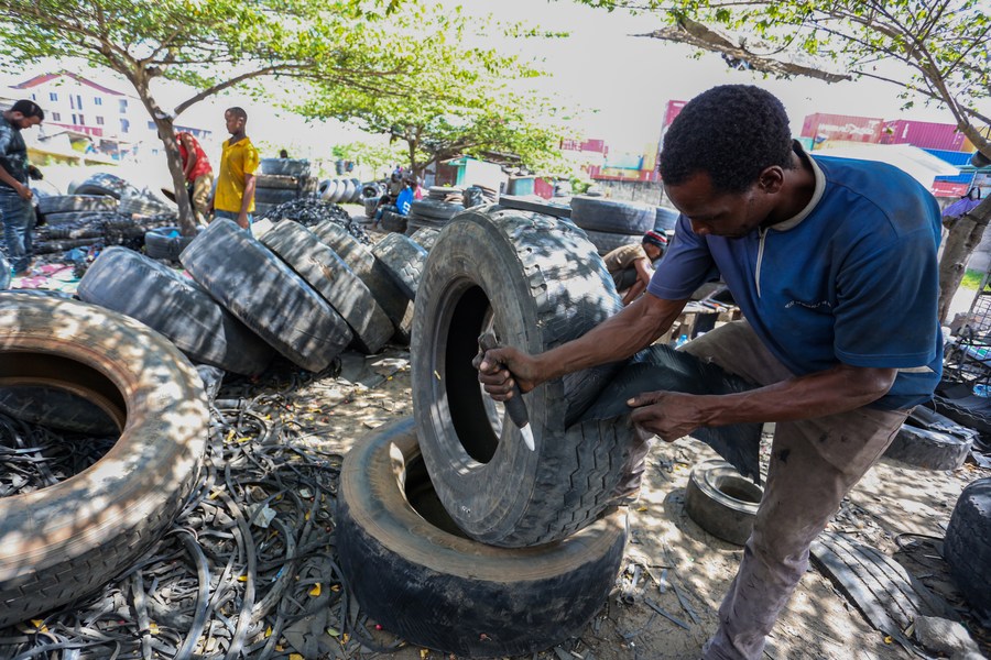 Patrick Yoram Sudae makes sandals locally known as "Katambuga" made from recycled tires at a street workshop in Dar es Salaam, Tanzania, Feb. 16, 2024. (Photo by Herman Emmanuel/Xinhua)
