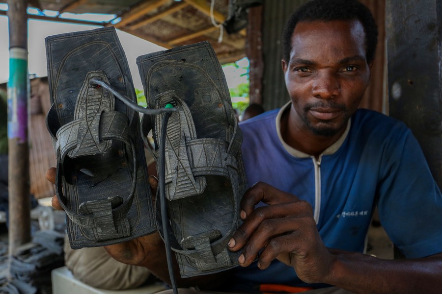 Patrick Yoram Sudae shows sandals locally known as "Katambuga" made from recycled tires at a street workshop in Dar es Salaam, Tanzania, Feb. 16, 2024. (Photo by Herman Emmanuel/Xinhua)